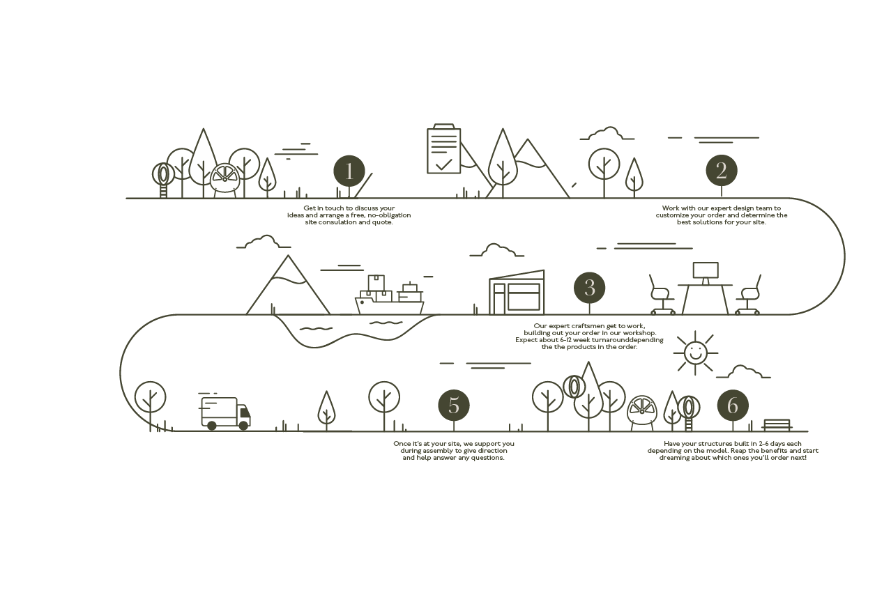 Production takes about 10-12 weeks for the Tree Tent, varying by structure, options, and order size, with shipping times based on method and location.